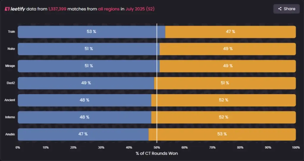 - Во-вторых, ранее у атаки было намного большее преимущество. В 2024 году террористы забирали на 10% больше раундов по сравнению со спецназом. Это настолько много, что карту можно было назвать односторонней.