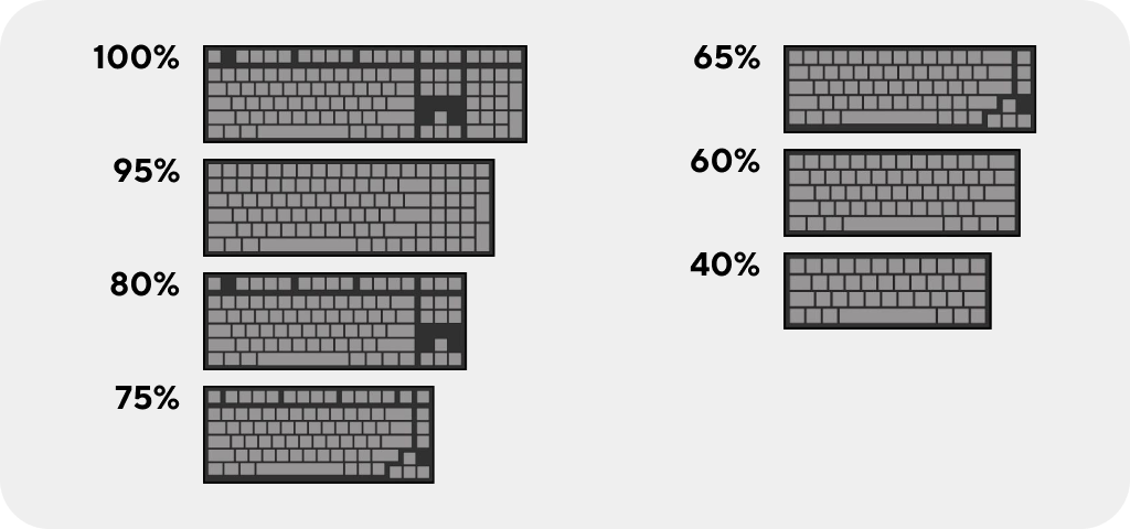 Встречаются клавиатуры совершенно разных размеров, которые обозначаются процентным соотношением от полноразмерной. Точного рецепта идеальных габаритов нет, всё индивидуально, однако большинство игроков выбирают более компактные варианты (80% и 75%) для удобного расположения на столе, да и NumPad в CS не пригодится.