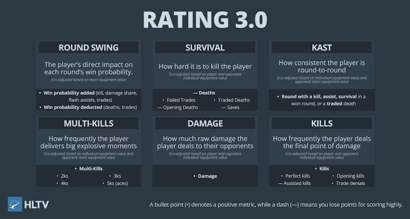 Рейтинговая система HLTV создавалась как универсальный инструмент для количественной оценки индивидуального выступления. Ранние версии опирались на базовые метрики: соотношение убийств и смертей, средний урон за раунд, использование гранат и так далее. Версия 2.0 стала следующим шагом — более комплексным, учитывающим выживаемость, мультифраги и влияние на экономику.