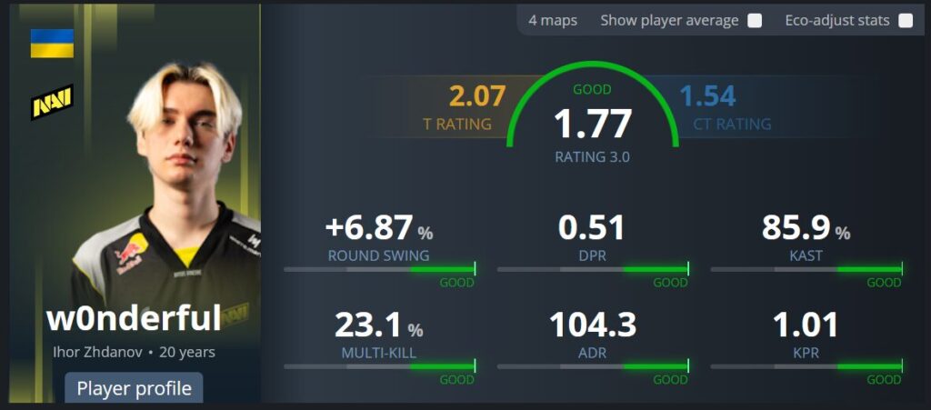Мейджор-турниры Игорь всегда проводил достаточно хорошо: прошлые три ивента w0nderful сыграл со средним рейтингом 1,14. Но действующий турнир Игорь отыгрывает с показателем 1,77. Да, значение набрано не против тир-1 команд, но если внимательнее разобрать, Natus Vincere явно начала использовать своего снайпера иначе. Возможно, это заготовка Андрея «B1ad3» Городенского — постараемся разобраться.