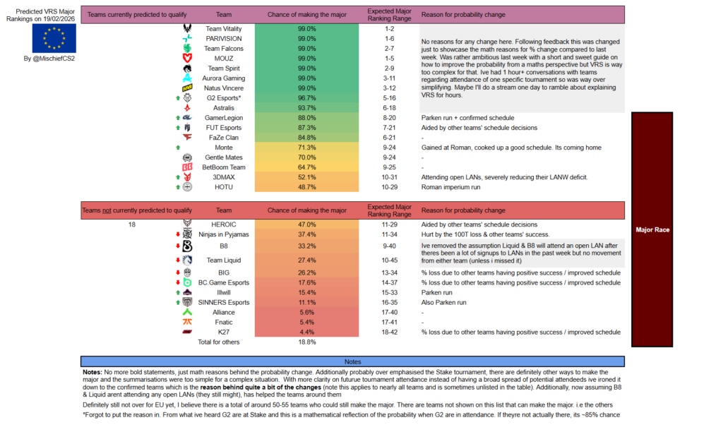 Обновлены прогнозы по VRS для европейских команд, которые могут быть приглашены на IEM Cologne Major. Есть три изменения среди тех, кто, как ожидается, попадёт на мейджор. В общей сложности около 50 европейских команд всё ещё имеют шанс.