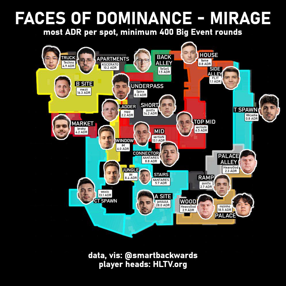 Аналитик btrams опубликовал пост на Reddit, в котором проанализировал ADR про-игроков на карте Mirage на основании 400 раундов на крупных турнирах.