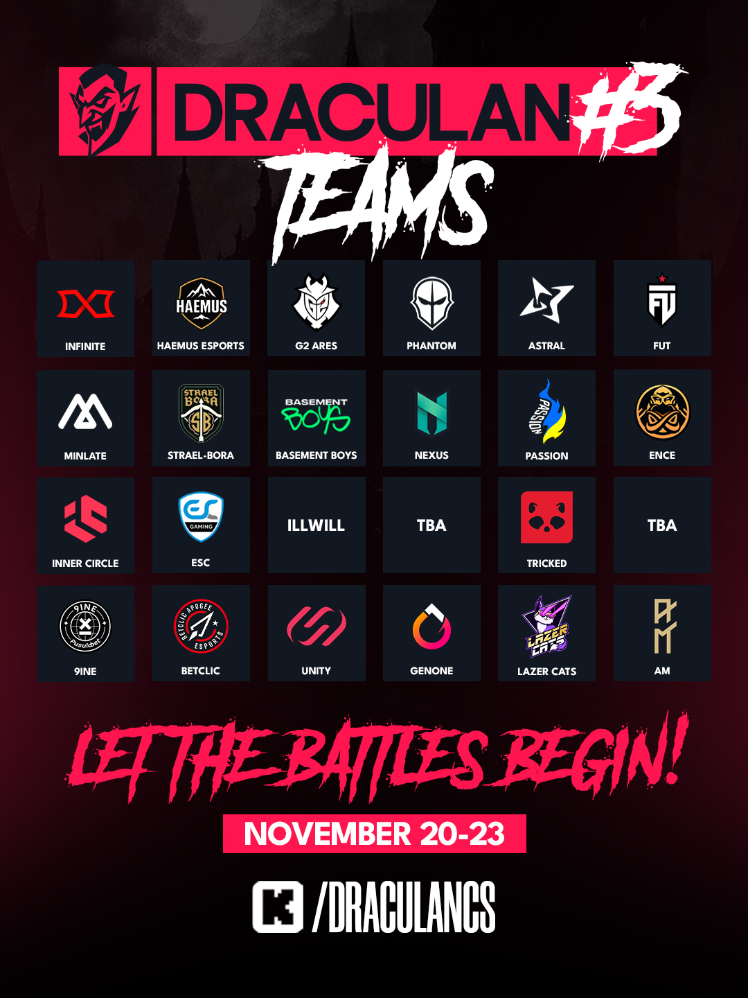 DraculaN 3 пройдёт с 20 по 23 ноября в Румынии. Всего в турнире примут участие 24 команды, а призовой фонд VRS-чемпионата составит €9 600.
