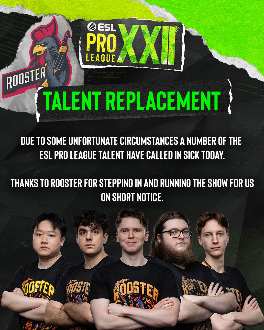 Турнирный организатор ESL объявил, что члены организации Rooster согласились подменить на трансляции сегодняшнего игрового дня ESL Pro League Season 22 заболевших участников студии освещения. Новость появилась на официальной странице ТО в соцсети X.