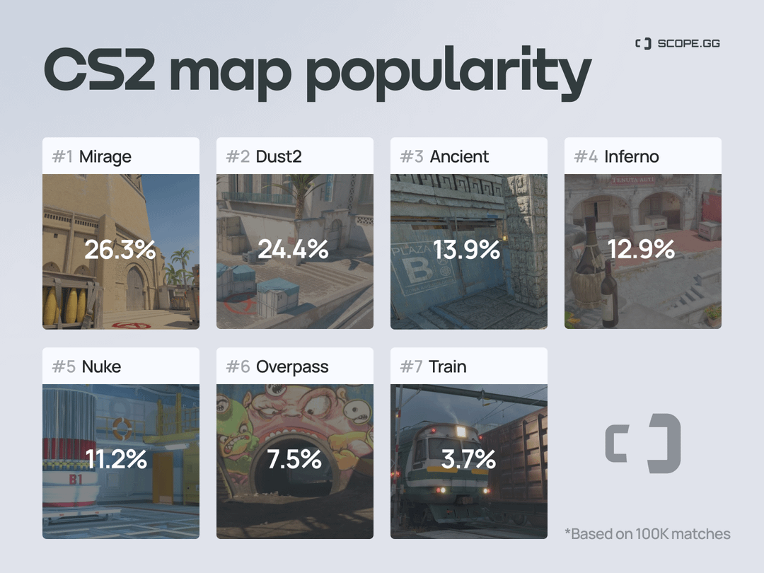 Исходя из анализа более 100 000 матчей, Mirage уверенно удерживает первое место по популярности — она сыграна в 26,3% игр. Совсем немного уступает Dust2 с показателем 24,4%. Замыкает тройку лидеров Ancient, набравшая 13,9%. Далее идут Inferno (12,9%), Nuke (11,2%) и Overpass (7,5%). Самой непопулярной картой стала Train — на её долю пришлось всего 3,7% сыгранных матчей.