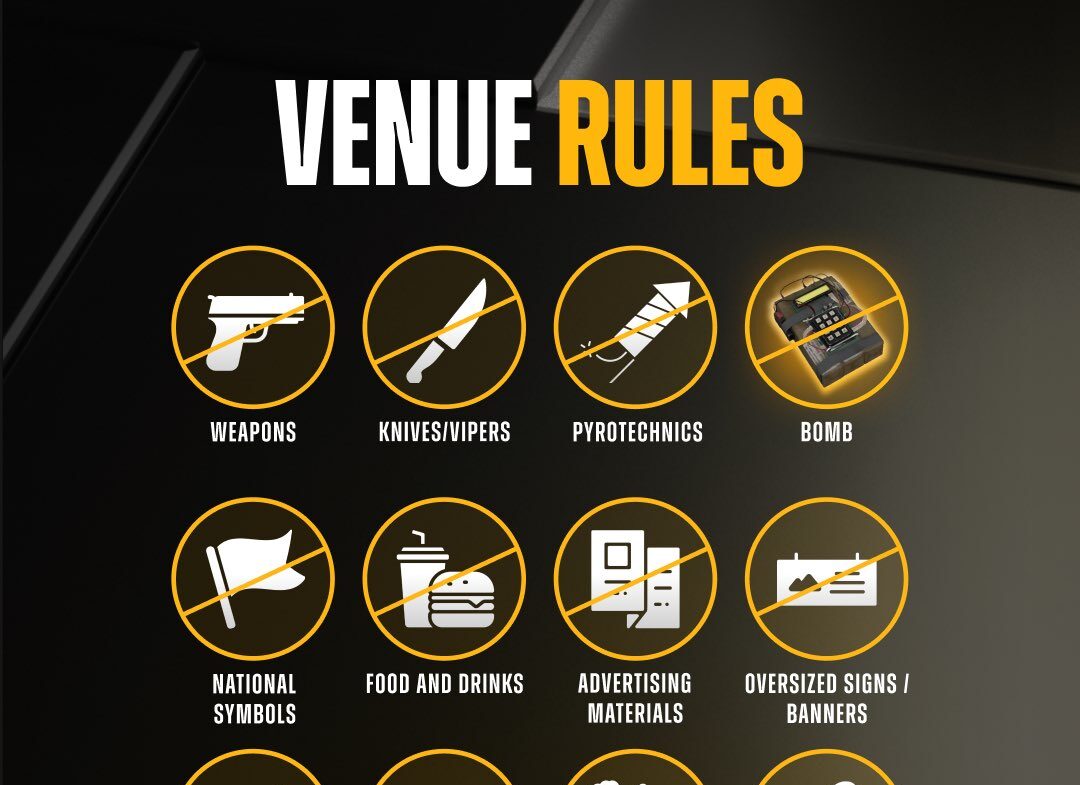 Запрещено проносить огнестрельное и холодное оружие, газовые балончики, пиротехнику, лазерные указки, дроны и взрывчатые вещества.