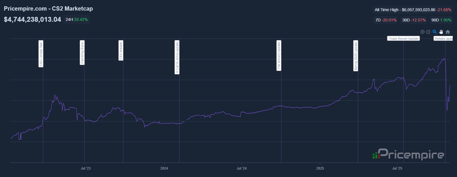 По данным портала Pricempire, рыночная капитализация скинов в Counter-Strike 2 продолжила расти и достигла отметки в $4 744 238 013.