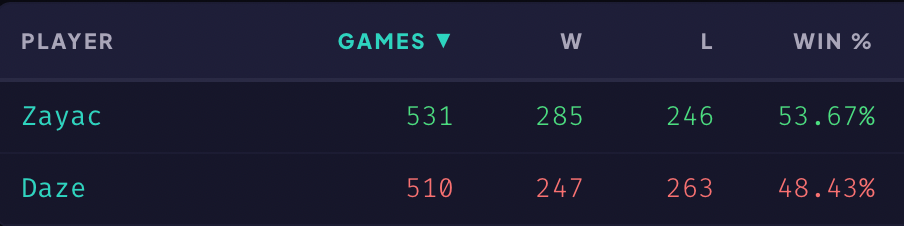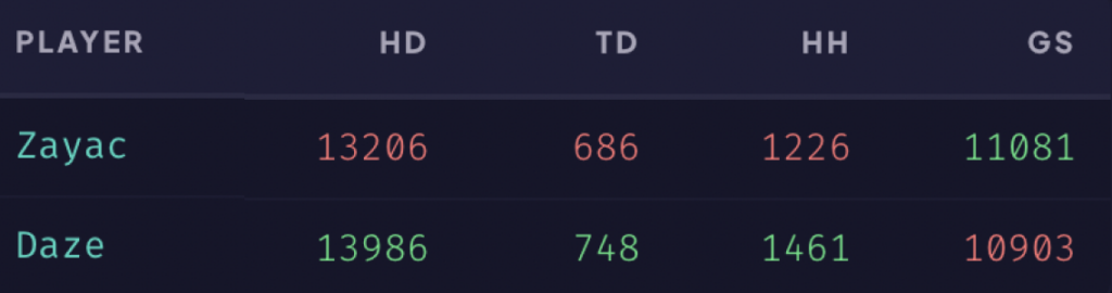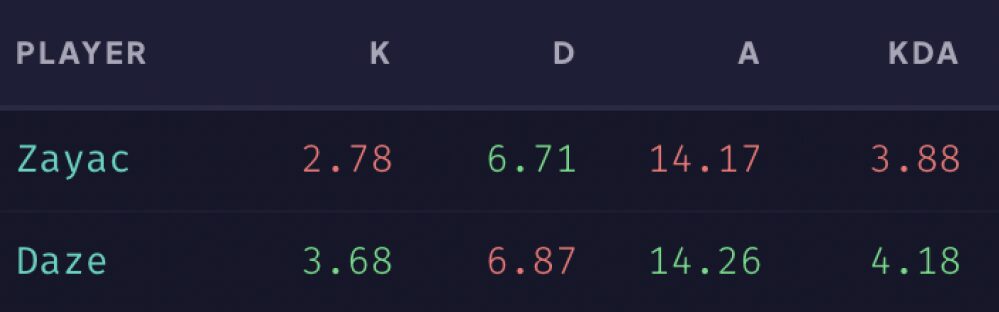 А вот уже по самым базовым игровым метрикам у daze показатели чуть лучше — он активнее дерётся, поэтому у него почти на один килл больше каждую игру и чуть больше ассистов. Но разница небольшая — можно списать на то, что Zayac чаще занимается координацией команды, поэтому не выходит файтиться на линии.