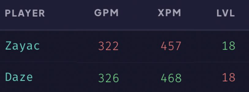 Начиная с патча 7.33, Zayac установил 323 Sentry и Observer Ward, а daze — 285 (для анализа берём только первые 12 минут игры). Разница почти 40 вардов — она сигнализирует не столько об уровне игроков, а скорее о стиле. Бакыт на правах более опытного дотера регулирует обзор своей команды и отчасти выполняет функции «пятёрки», в это время daze больше дерётся и фармит, как мы выяснили из данных выше.