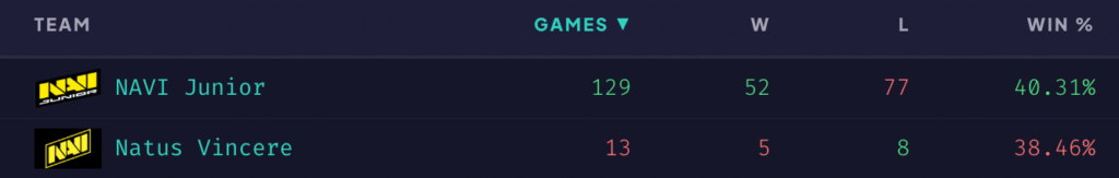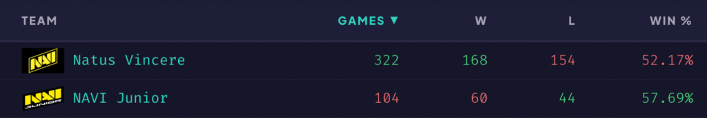 Показатели включают ещё и матч со старым составом NAVI, поэтому сделаем на это поправку. Но даже так винрейт за NAVI Junior под 60% — отличный результат для команды, которая в том числе впервые ездила на тир-1 турниры, поэтому не скажешь, что победы набиты на стаках из открытых квалификаций.