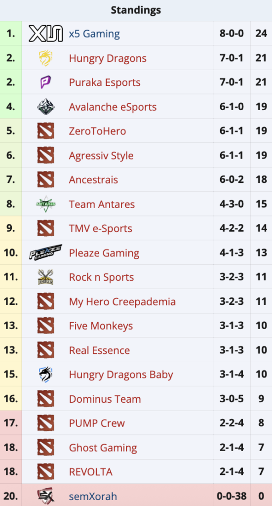 Второе-третье места делят Hungry Dragons, попавшая на турнир по инвайту, и победительница Avalanche Arena Puraka Esports — это совсем молодой ростер, который заметно прогрессирует и всё чаще выходит в финальную стадию открытых квалификаций, но пока не может попасть в закрытую часть. Ещё из участников чемпионата Бразилии неплохо в квалификациях смотрится Aggressive Style.
