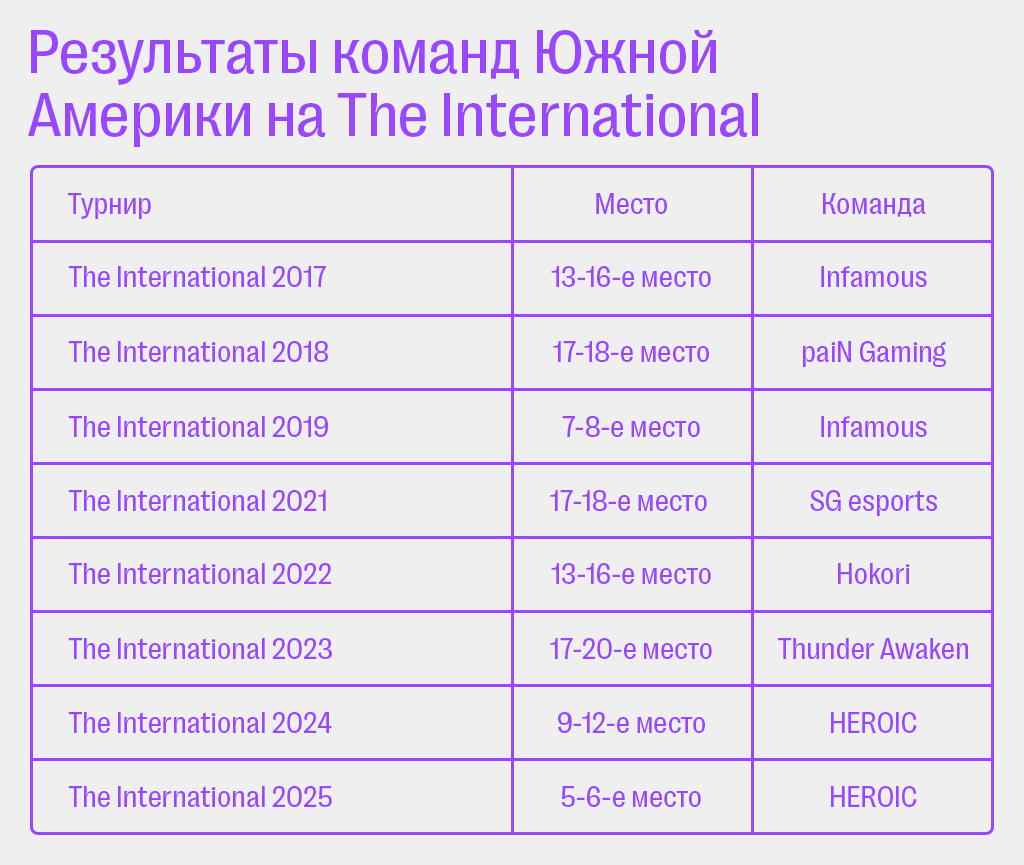 Но заметного скачка сцены не случилось — долгое время южноамериканские команды приезжали на турниры и занимали одно из последних мест. Иногда в комьюнити и вовсе призывали отказаться от слота для этого региона, но Valve к таким мнениям не прислушалась.
