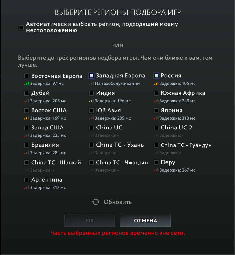Внутриигровые серверы «Западной Европы» в Dota 2 временно недоступны из-за технического обслуживания.