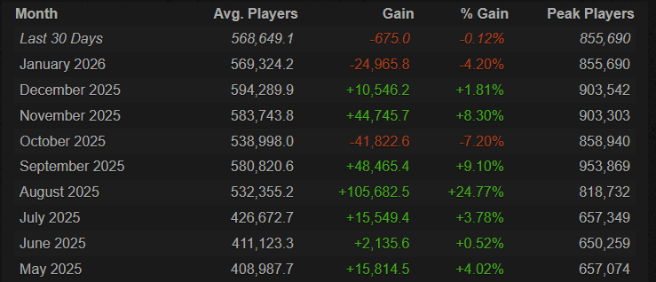 Средний онлайн достиг 569 324 человека — это на 4,2 % меньше, чем в декабре. Пиковое значение составило 855 690 игроков, что почти на 48 тыс. меньше предыдущего месяца. Январь прервал тенденцию роста, продлившуюся два месяца.