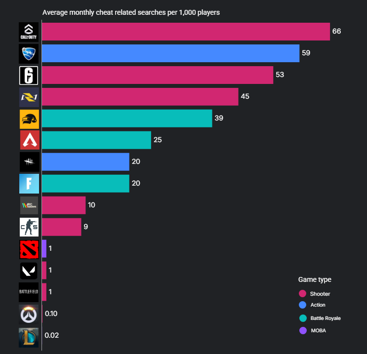 Менее популярным среди игроков, использующих читы, оказался жанр MOBA: в среднем фиксируется лишь 0,51 запрос на тысячу пользователей. В частности, в Dota 2 одна попытка поиска, в League of Legends этот показатель ещё ниже — всего 0,02, а лидеры по интересу к нечестной игре — это Rocket League и Call of Duty с 59 и 66 соответственно.