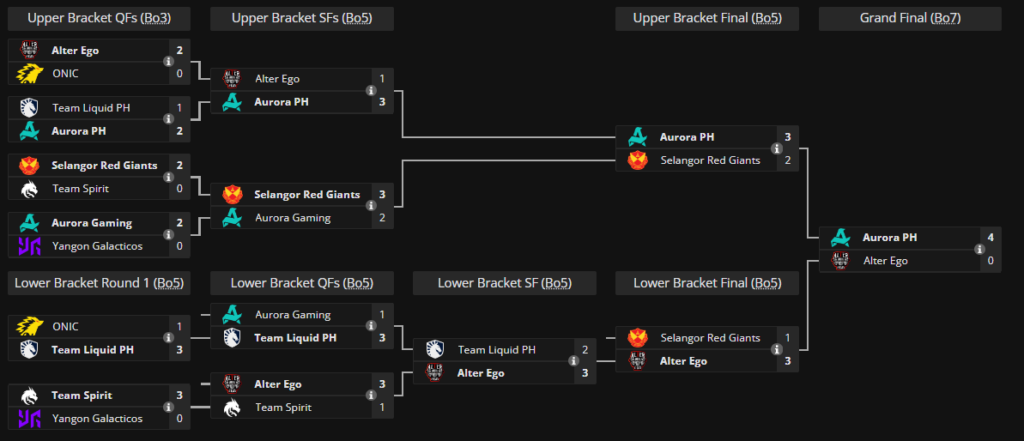 В свою очередь, Aurora PH научилась лучше других использовать мету бойцов и по ходу плей-офф превратилась в главного фаворита чемпионата мира. После победы над Liquid команда обыграла двух других претендентов на титул: индонезийскую Alter Ego (3:1) и Selangor Red Giants из Малайзии (3:2).
