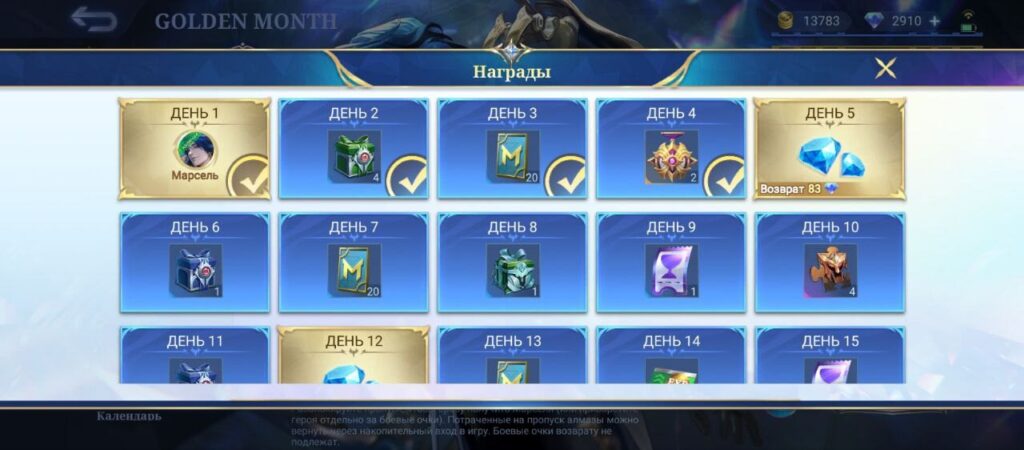 С 11 по 24 марта Марсель доступен в особом ивенте по скидке за 419 алмазов. Кроме того, можно вернуть всю потраченную донатную валюту, если заходить в игру 22 дня подряд. Примерно раз в неделю вы будете получать часть алмазов обратно, а в другие дни — фрагменты обликов, билеты для магазина и другие ресурсы.