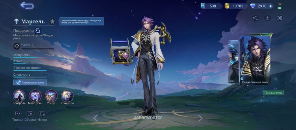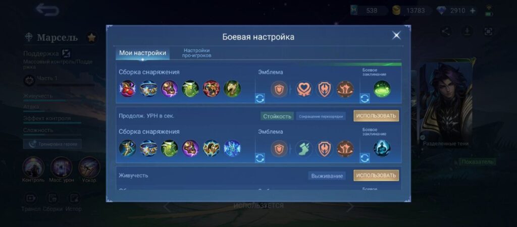 В теории эмблемы поддержки тоже доступны: Марсель получит дополнительное лечение, снижение кулдауна и скорость передвижения. Но скейлы на навыки станут ниже, а бонусы могут оказаться недостаточно высокими, чтобы оправдать слишком осторожный геймплей.