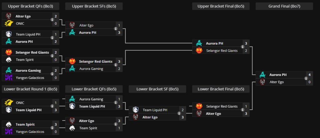 Яркого финала при этом не вышло: Aurora выглядела значительно сильнее и одержала уверенную победу, сохранив за Филиппинами звание сильнейшей страны в Mobile Legends. Alter Ego была повержена со счётом 4:0, не имея больших шансов на победу ни в одной из игр.