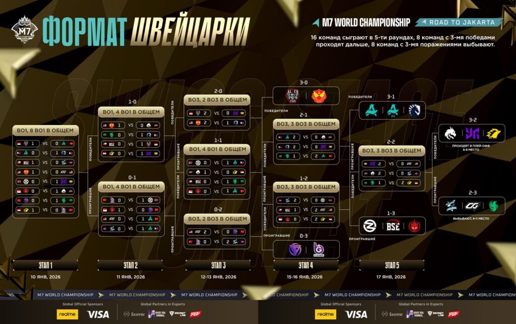 - Swiss Stage (10-17 января): 16 команд разыграли 8 путевок в плей-офф по швейцарской системе. Чтобы пройти дальше, нужно было выиграть 3 матча из 5, при этом после третьего поражения команда вылетала с M7.