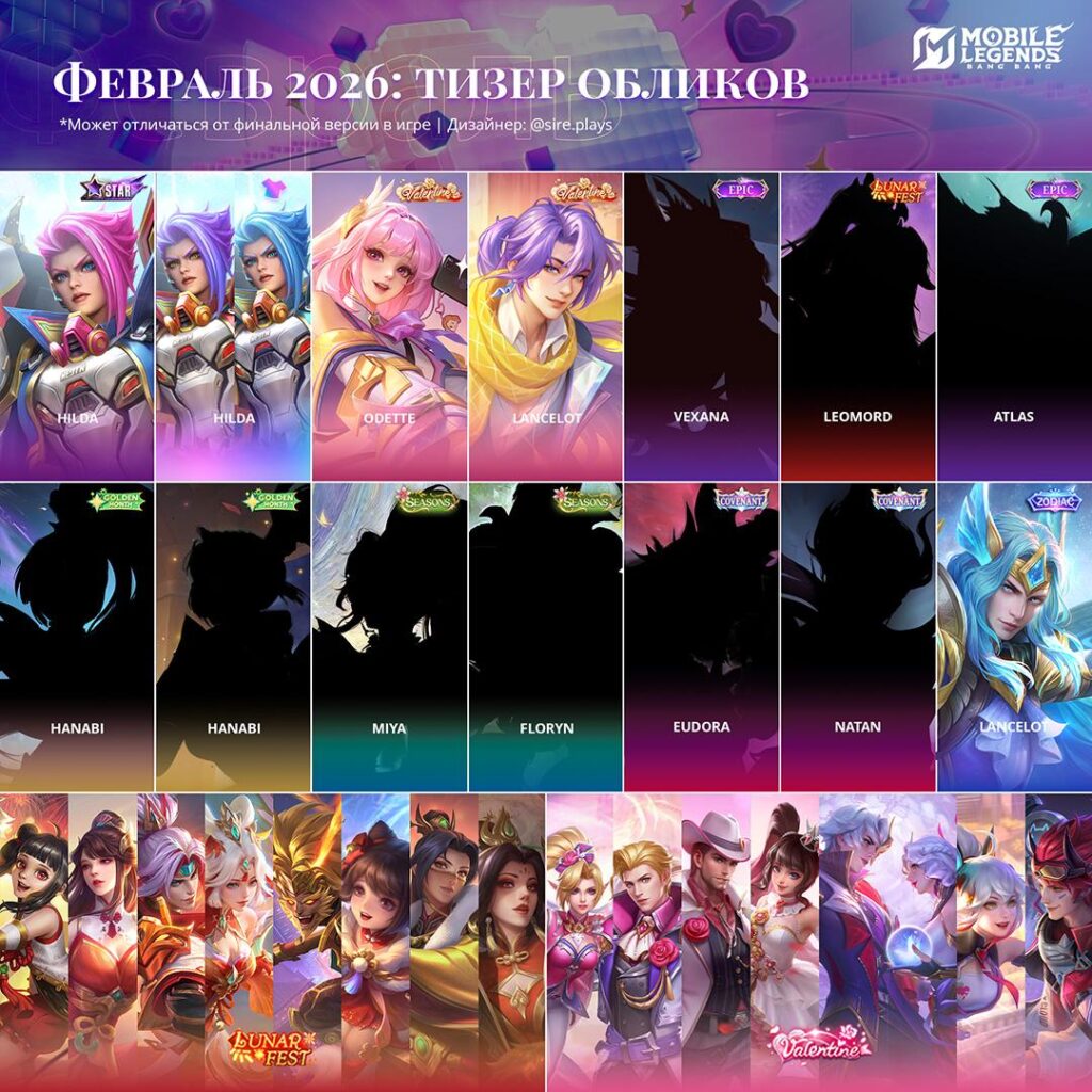 В официальных соцсетях MLBB опубликована картинка-тизер всех новых обликов, которые станут доступны в игре в феврале 2026 года. Всего в этом месяце можно будет получить 29 косметических наборов.