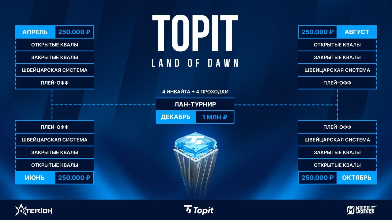 Турнирный оператор Aterion Legends в официальном Telegram-канале анонсировал серию соревнований Topit Land of Dawn по Mobile Legends: Bang Bang в 2026 году.